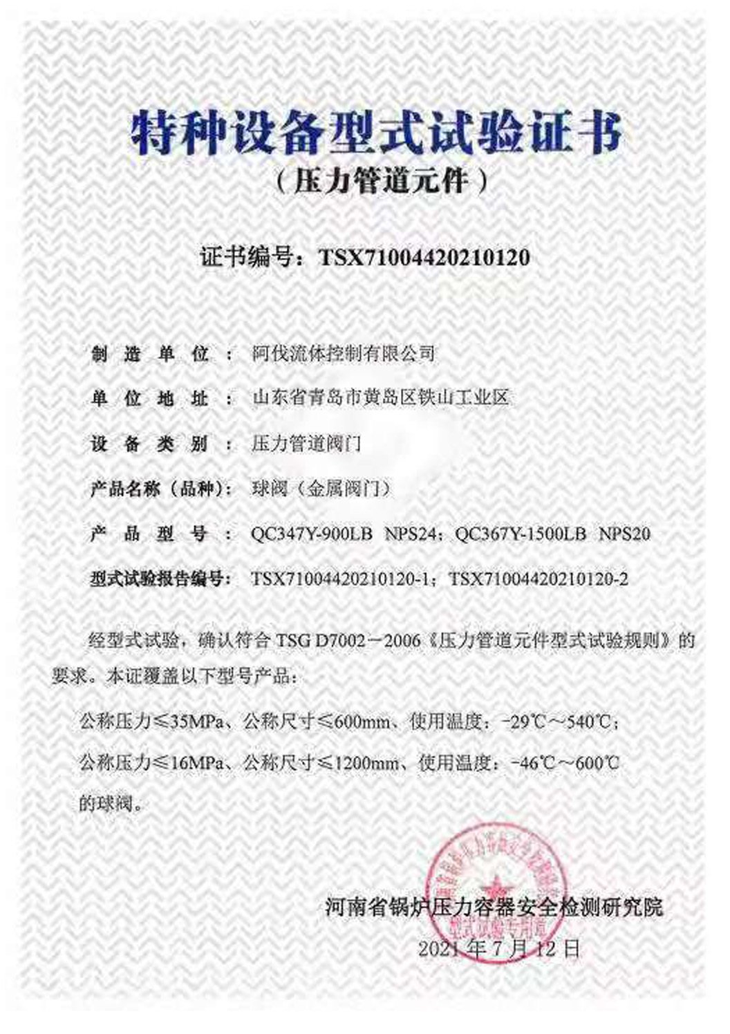 为了进一步提升公司阀门制造能力,增加阀门制造品种和规格,我公司委托第三方检验机构--河南省锅炉压力容器安全检测研究院对两台C型球阀进行了型式试验)。此次检验的阀门产品两台阀门,分别为:QC347Y-900LB,NPS24和QC347Y-1500LB,NPS20的C型耐磨球阀。经过检验人员严格的测试,我公司生产的两台阀门顺利通过了各项苛刻的考验,检验结果完全符合《压力管道元件型式试验规则》(TSG D7002-2006)的要求,顺利获取特种设备型式试验证书(压力管道元件)。